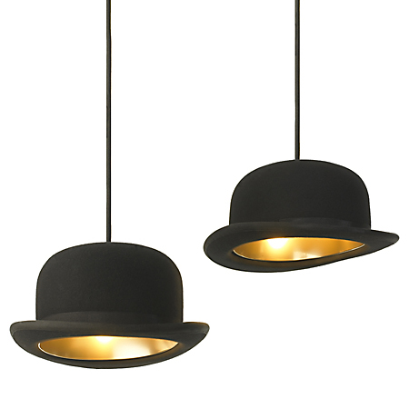 Nämä valloittavat hattuvalaisimet on suunnitellut Jake Phipps. Törmäsin hattuihin jälleen, kun klikkailin Somanetin (www.somanet.fi) verkkokaupassa. Knallihattu on nimeltään Jeeves ja silinterihattua kutsutaan Woosteriksi. Hattujen pinta on huopaa ja sisäkupu anodisoitua alumiinia. Johto on kangaspäällysteinen. Jeevesin strategiset mitat on LSK 30*25*13 cm ja Woosterin LSK 32*26*23 cm. Jeevesin sisäpuoli on kullansävyinen ja Woosterin hopea.